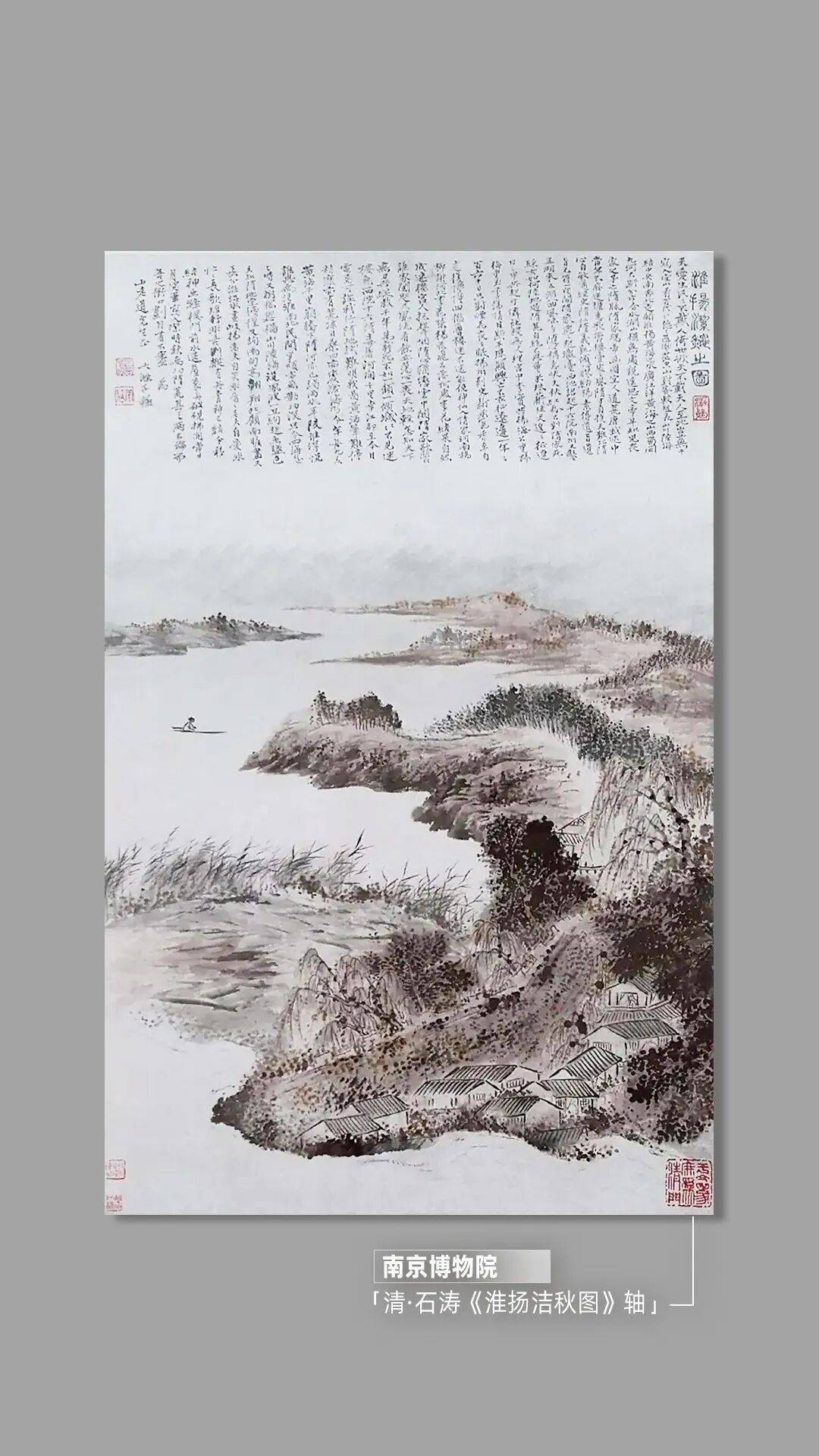 提到秋天,估计大多数人会想到“秋高气爽”。但清代画家石涛笔下的“秋”,源于一场水患。康熙四十四年夏末,江苏北部区域惨遭严重的洪灾,直到入秋才慢慢退去。石涛用洗练的笔墨,生动地勾画了扬州城郊一隅的秋色景致,使人恍若身临其境。画面上,秋水茫茫,孤舟漂泊,几片红枫点燃了凉意中的暖色。