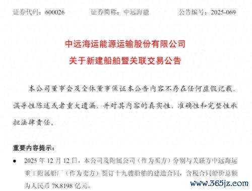 12月12日晚间,中远海运能源运输股份有限公司宣布,与关联方中远海运重工附属船厂签订19艘船舶建造合同,含税合同船价总额为人民币78.8198亿元,连同建造期利息、监造费等资本化费用的总投资约为81.24亿元。